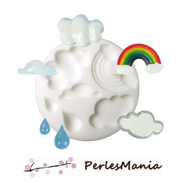 1 MINI MOULE EN SILICONE NUAGE, GOUTTE, ARC EN CIEL CREATIONS FIMO SCULPEY CERNIT ref 284445 Moule en silicone ( environ 7cm )extra flexible, pour un démoulage facile et des motifs précis. Idéal pour réaliser des miniatures décoratives pour la carterie, le scrap, la bijouterie… 6 empreintes Dimensions des empreintesenviron 10mm- 35mm. S’utilise avecde la pâte polymère (cuisson possible av