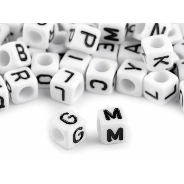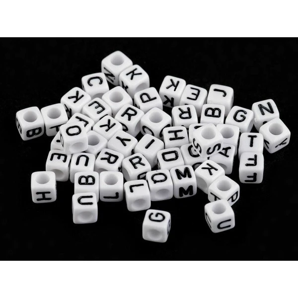 Emballage 47 – 50 pcTirant Trou de 3,5 mmDimensions 6 x 6 x 6 mmPerles avec des lettres ou des numéros de plaisir particulièrement des enfants des écoles. Peut être utilisé pour produire populaires bracelets d’amitié avec des inscriptions. Perles en forme de cube. Comme un cordage de matériel que vous pouvez utiliser la bande élastique et nylon, divers lacets, des bandes de caoutchouc, etc..Dans le sac est un mélange de chiffres ou de lettres. Le sac peut contenir n’importe quelle combinaison de lettres de l’alphabet ou des chiffres, les emballages individuels de l’un à l’autre peut varier. Les lettres de l’alphabet anglais, donc sans signes diacritiques.Dans un sac, 47 – 50 pcs perles.