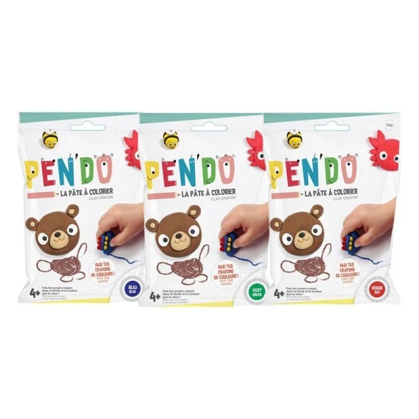 Crayons à faire soi-même. Fabriquez vous-même vos crayons de couleurs avec les pâtes Pen’Do. Ce morceau de pâte à modeler rouge vous permettra de créer vos propres crayons dès l’âge de 4 ans. Il suffit de mélanger les pâtes afin d’obtenir des formes originales et coloréesanimaux, fruits, personnages, objets du quotidiens. Il faut laisser sécher vos moulages avant de les utiliser pour colorier. 3 couleursrouge, vert, bleu.