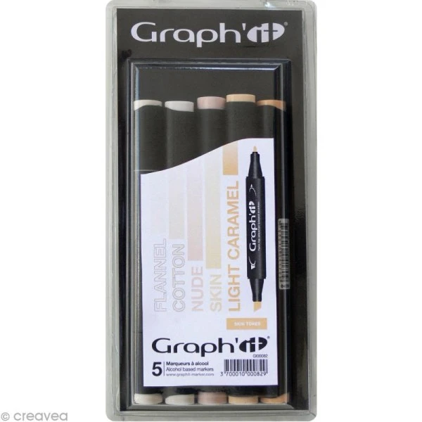 Assortiment de marqueurs Graph’it tons chair composé de 5 feutres à alcool double pointe, parfaits pour les dessinateurs, les scrappeuses et les étudiants en Beaux-Arts. Comme le Copic ou le Promarker, les feutres Graph’it tons chair vous faciliteront la colorisation de tous vos dessins.