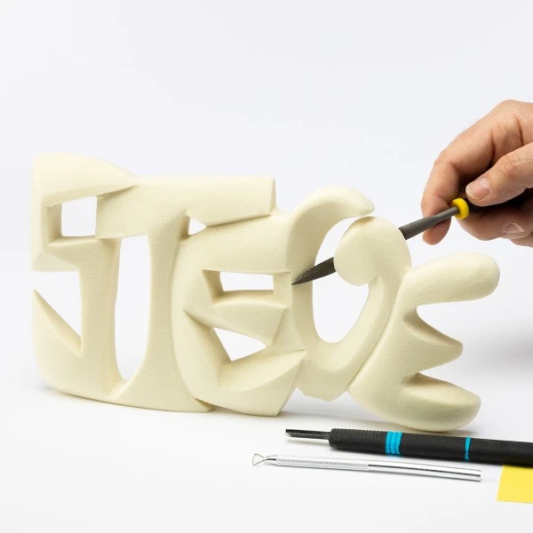 Utilisez des outils comme une scie ou encore des limes pour réaliser votre forme dans le matériau. La taille de ce bloc à sculpter de 30 x 15 x 2,5 cm, vous permettra de réaliser toutes sortes de formes comme un prénom, une bonne idée déco pour la chambre de votre enfant !