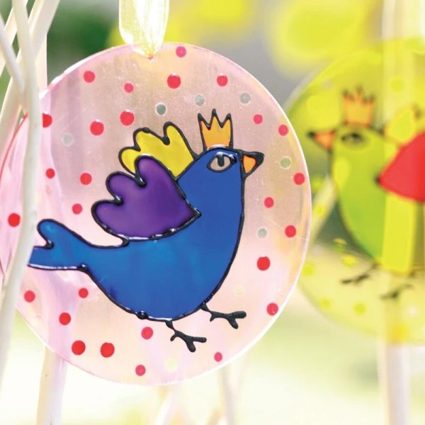 – 4 pots de 15 ml de peinture pour verrejaune soleil, rouge cerise, bleu gentiane et vert clair.