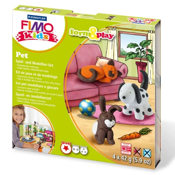 – Modeler le(s) sujet(s) de son choix à l’aide du livret, des 4 pains de Fimo Kids et du bâtonnet en plastique qui sont fournis dans le kit.