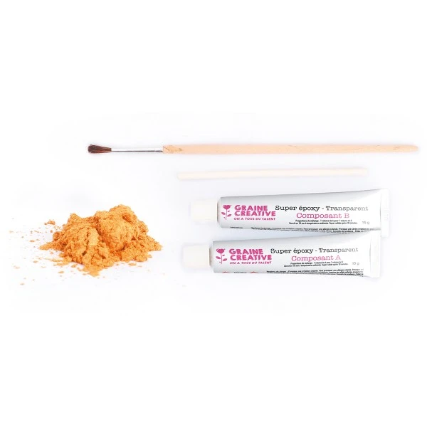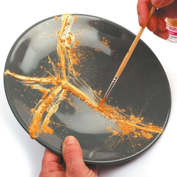 Le kit contient tout ce qu’il vous faut pour réparer élégament votre vaisselle casséede la résine epoxy, de la poudre dorée et des outils.