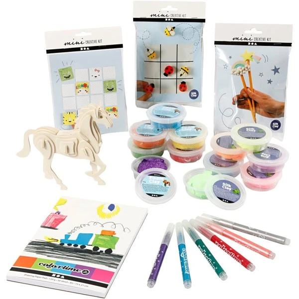 À vos marques, prêts, créez ! Ce kit contient beaucoup de matériel pour des heures de créativité et de contemplation en intérieur, pour les enfants à partir de 6 ans. Il comprend des puzzles 3D, les pâtes à modeler autodurcissantes Foam Clay et Silk Clay, trois mini kits créatifs avec du matériel pour de petits projets créatifs amusants, des feutres à paillettes et un bloc à dessin..