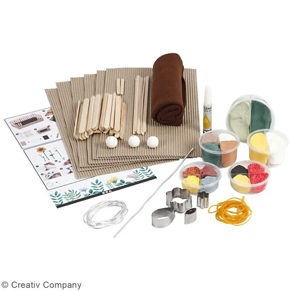 Contenu: pâtes Silk Clay et Foam Clay de différentes couleurs, boules de coton, fil d’aluminium, carton ontulé, feutre, élastique, bâtons de glace de différentes tailles, moules et colle.