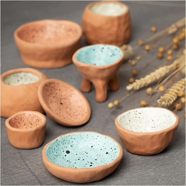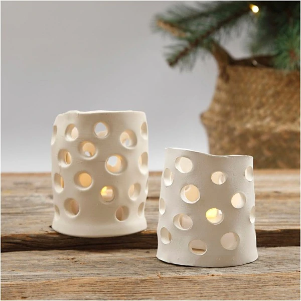 Réchauffez et pétrissez bien l’argile avec vos mains, puis formez des bols et des plats en utilisant la technique du pincement. Vous pouvez également aplatir l’argile et découper des décorations à suspendre à l’aide d’un emporte-pièce ou fabriquer des lanternes avec des trous sur les côtés pour suspendre. Lisser la surface de l’argile avec de l’eau au fur et à mesure..