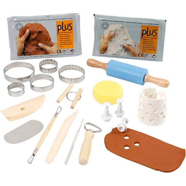 Contenuargile autodurcissante, set de modelage, rouleau à pâtisserie, emporte-pièces.
