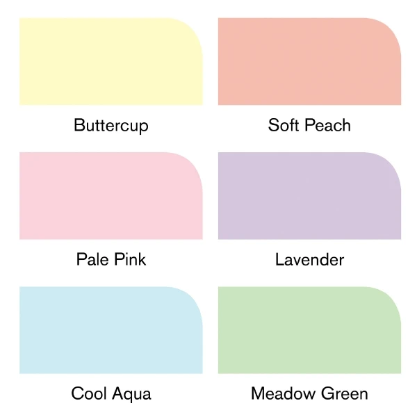 - Couleurs Tons pastelBouton d’or Y417, Pêche douce O138, Rose pâle R519, Lavande V518, Aqua frais C429 et Vert prairie G339