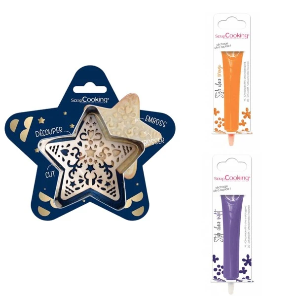 Description de Kit pour biscuit en relief Étoile + 2 Stylos au chocolat orange et violet