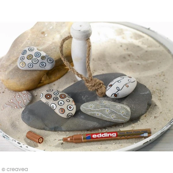 Conseils : Appliquez le feutre Edding 780 Blanc d’abord sur une feuille de papier, et non directement sur l’objet à peindre, car l’activation du système de valve du marqueur peut parfois engendrer la sortie d’un surplus de peinture.