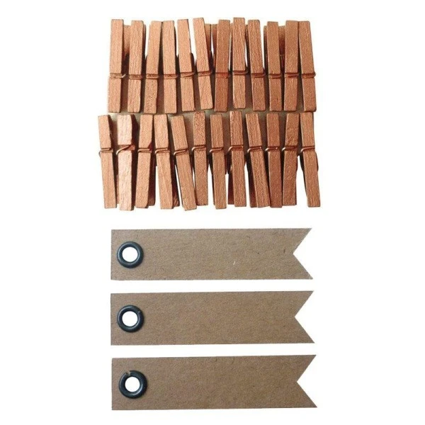 Mini pinces à linge décoratives + 20 étiquettes kraft à œillet