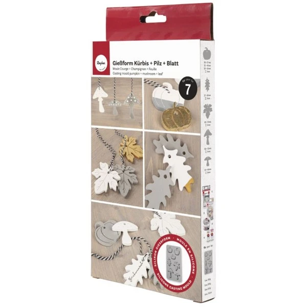 Créez de jolies pièces avec ce moule en silicone sur le thème de l’Automne de Rayher ! Cette plaque de contient en fait 7 moules différents avec des formes de feuilles, de champignons et de courges pour réaliser des créations de saison.