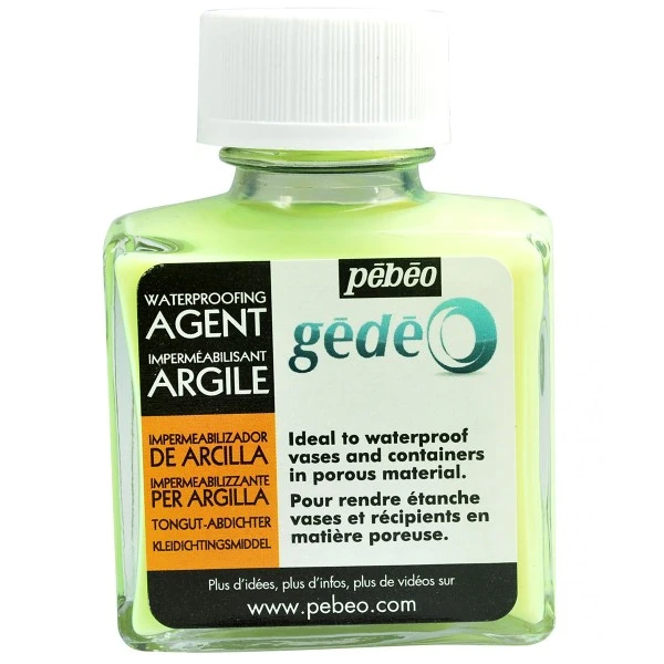 L’imperméabilisant pour argile Gédéo de Pébéo est très utile pour rendre étanche vases et récipients en matières poreuses. A base de résine acrylique, le produit pénètre profondément dans l’argile et en bouche les moindres pores et fissures. Sa coloration jaune permet de repérer les manques éventuels à l’application. Il devient transparent une fois sec.