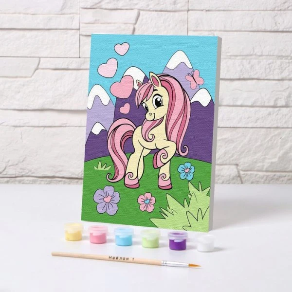 Description de Peinture Par Numéros, » Happy Pony « 21 × 15 cm, sur toile DIY Kit, Chambre Décor Ensemble, Enfants Ar