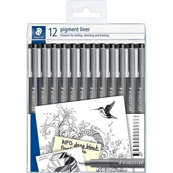 Description de Pochette de 12 feutres fins – Noir – Assortiments de pointes – Pigment Liner – Staedtler